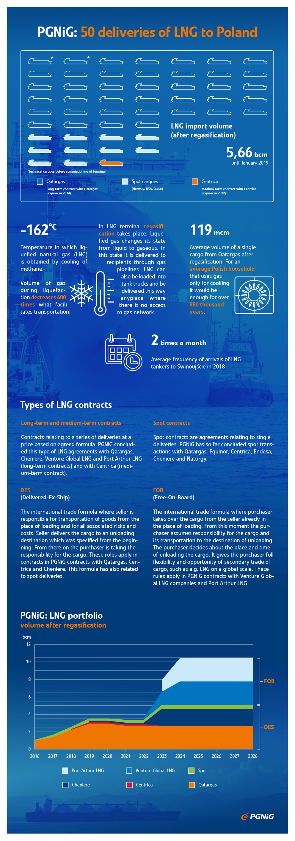At the end of 2018, PGNiG signed four long-term contracts for the purchase of LNG from the USA. Deliveries from one of the American partners – Cheniere Energy – will commence this year.
