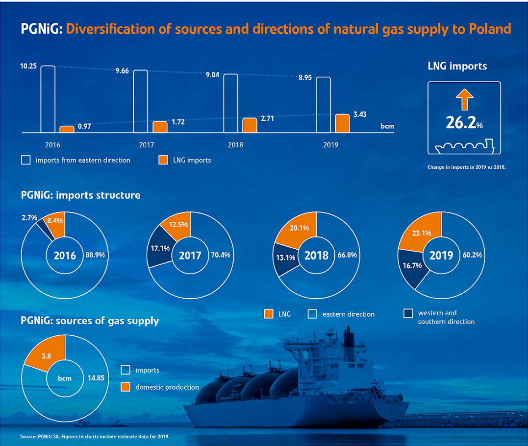 In 2019, PGNiG brought 3.43 billion cubic metres of liquefied natural gas into Poland, over one-fourth more than a year earlier. LNG imports from the US, Qatar and Norway increased by about 0.7 billion cubic meters (after regasification) on 2018. Imports from Russia amounted to 8.95 billion cubic metres in 2019, compared with 9.04 billion cubic metres a year earlier.